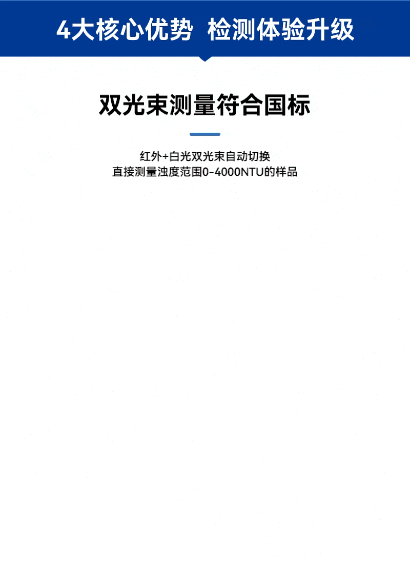 2、白光+紅外雙光束自動(dòng)切換,可直接測(cè)量濁度范圍0-4000NTU的樣品;