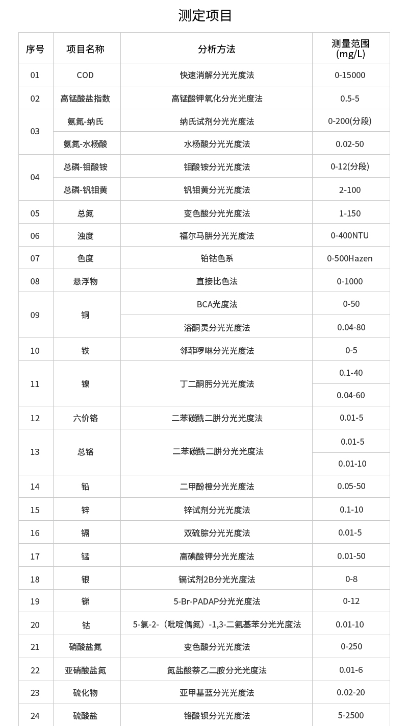 檢測限:COD高量程3mg/L;COD低量程0.5mg/L